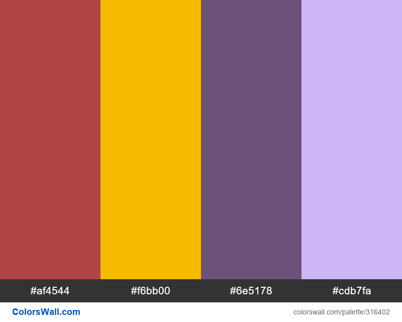 VERHEXEN: #af4544, RGB: (175, 69, 68); VERHEXEN: #f6bb00, RGB: (246, 187, 0); VERHEXEN: #6e5178, RGB: (110, 81, 120)