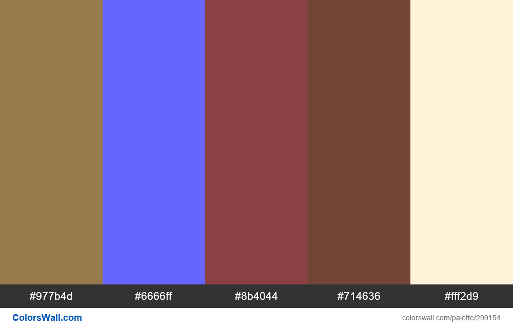 HEX: #977b4d, RGB: (151, 123, 77); HEX: #6666ff, RGB: (102, 102, 255); HEX: #8b4044, RGB: (139, 64, 68)