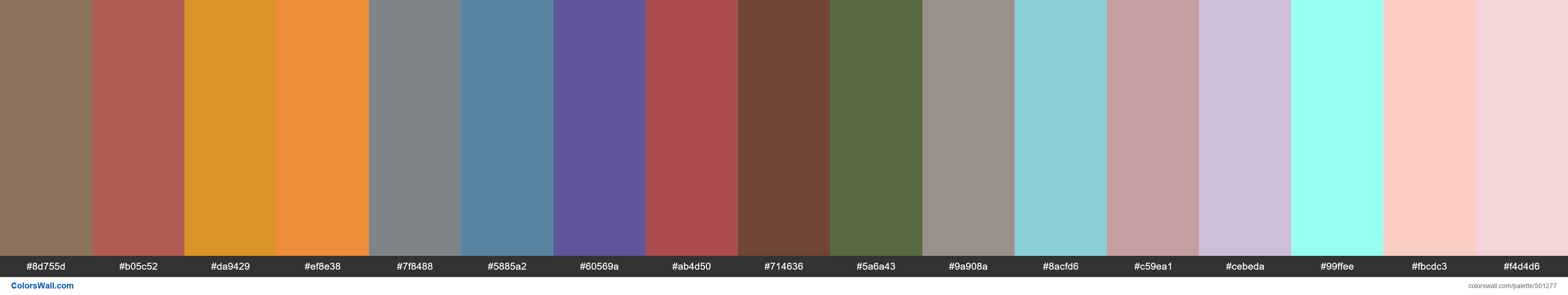 HEX: #8d755d, RGB: (141, 117, 93); HEX: #b05c52, RGB: (176, 92, 82); HEX: #da9429, RGB: (218, 148, 41)