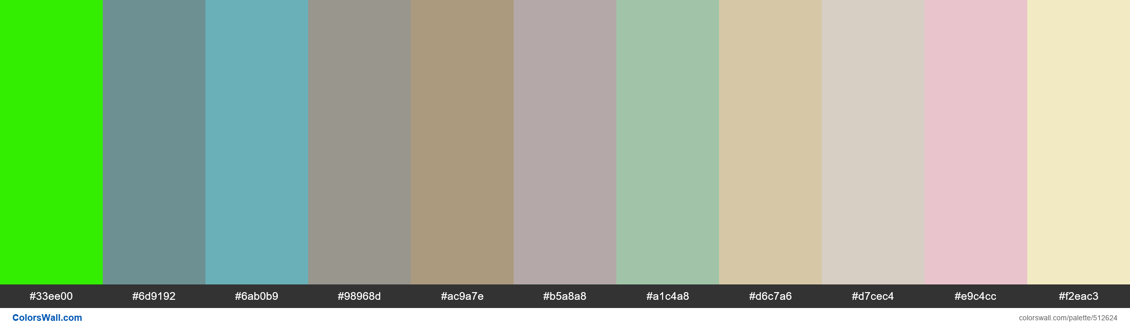 HEX: #33ee00, RGB: (51, 238, 0); HEX: #6d9192, RGB: (109, 145, 146); HEX: #6ab0b9, RGB: (106, 176, 185)