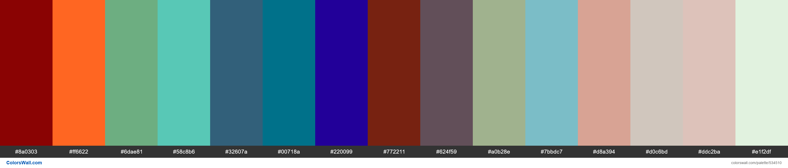 HEX: #8a0303, RGB: (138, 3, 3); HEX: #ff6622, RGB: (255, 102, 34); HEX: #6dae81, RGB: (109, 174, 129)