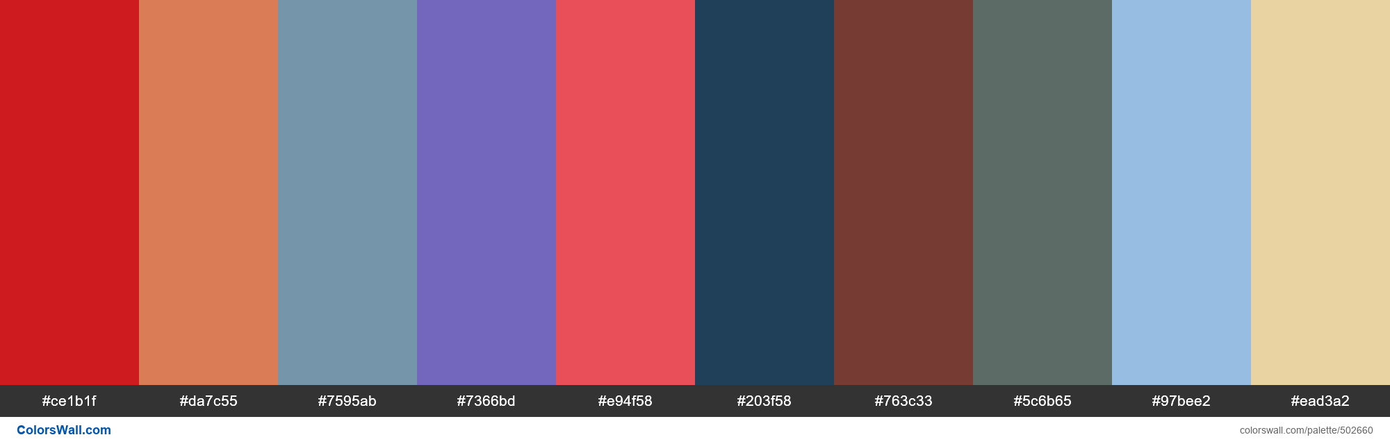 HEX: #ce1b1f, RVB: (206, 27, 31); HEX: #da7c55, RVB: (218, 124, 85); HEX: #7595ab, RVB: (117, 149, 171)