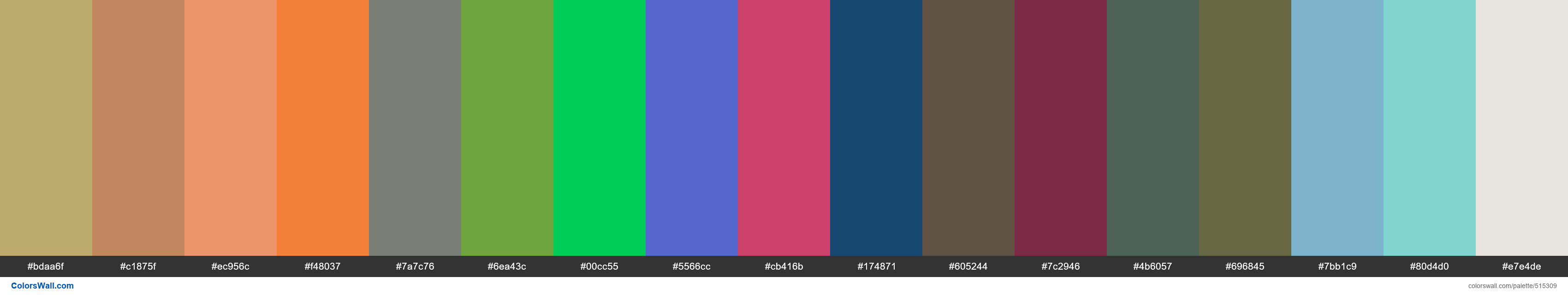 ESADECIMALE: #bdaa6f, RGB: (189, 170, 111); ESADECIMALE: #c1875f, RGB: (193, 135, 95); ESADECIMALE: #ec956c, RGB: (236, 149, 108)