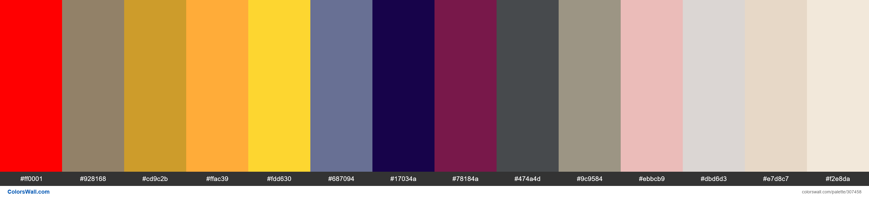 HEX: #ff0001, RGB: (255, 0, 1); HEX: #928168, RGB: (146, 129, 104); HEX: #cd9c2b, RGB: (205, 156, 43)