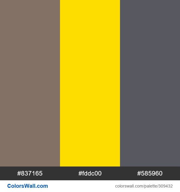 HEX: #837165, RGB: (131, 113, 101); HEX: #fddc00, RGB: (253, 220, 0); HEX: #585960, RGB: (88, 89, 96)