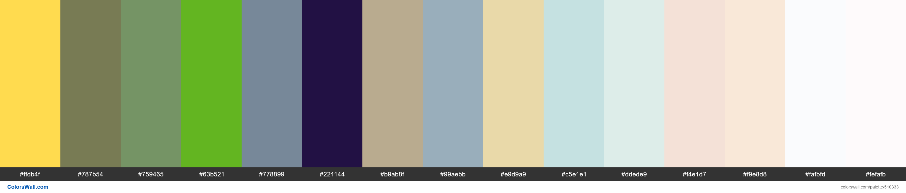 HEX: #ffdb4f, RGB: (255, 219, 79); HEX: #787b54, RGB: (120, 123, 84); HEX: #759465, RGB: (117, 148, 101)