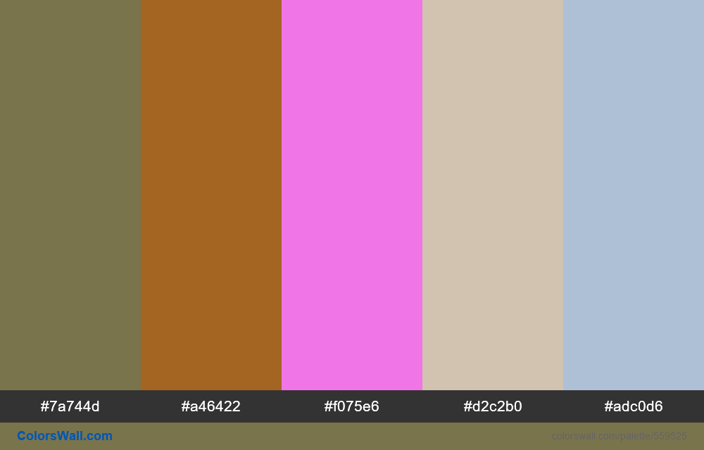 HEX: #7a744d, RGB: (122, 116, 77); HEX: #a46422, RGB: (164, 100, 34); HEX: #f075e6, RGB: (240, 117, 230)