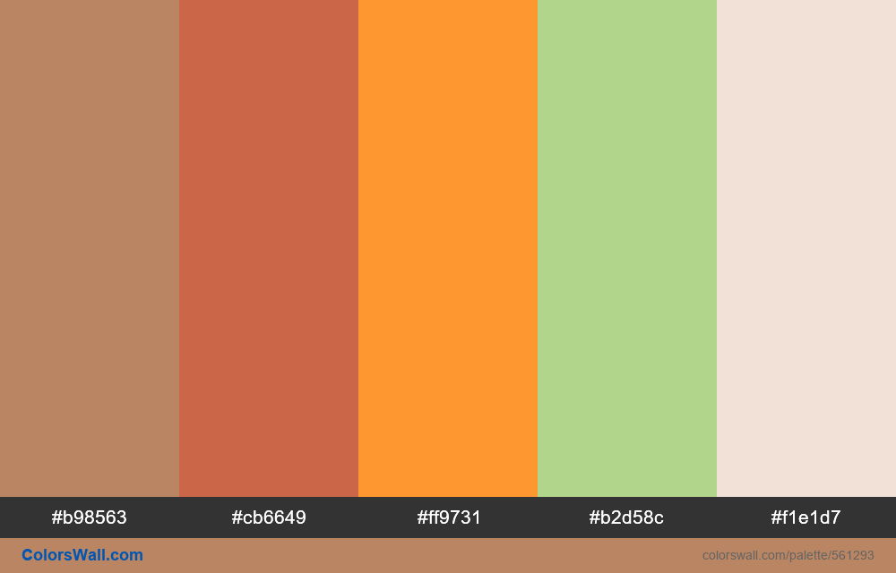 HEX: #b98563, RGB: (185, 133, 99); HEX: #cb6649, RGB: (203, 102, 73); HEX: #ff9731, RGB: (255, 151, 49)