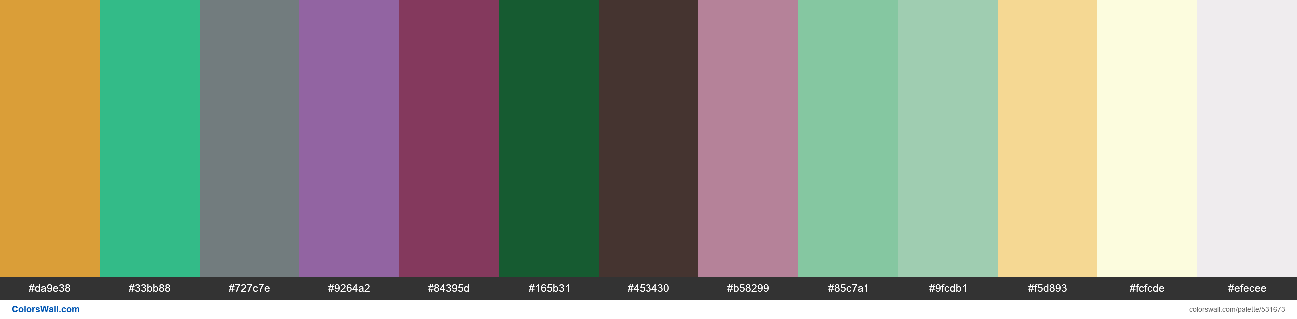 Golden Hamster, Aztec Jade, Ocean Swell, Empire Violet, Berry Patch, Crusoe, Rebel, Mauve Orchid, Foul Green, Retro Mint, Poached kody kolorów HEX, informacje RGB w tabeli