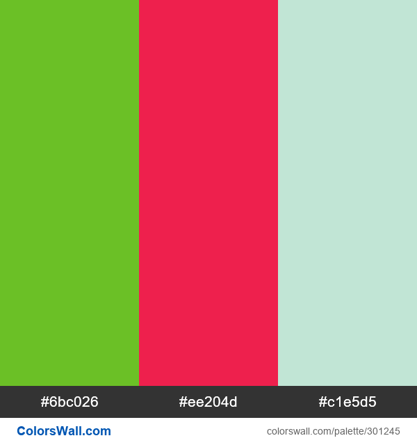 HEX: #6bc026, RGB: (107, 192, 38); HEX: #ee204d, RGB: (238, 32, 77); HEX: #c1e5d5, RGB: (193, 229, 213)