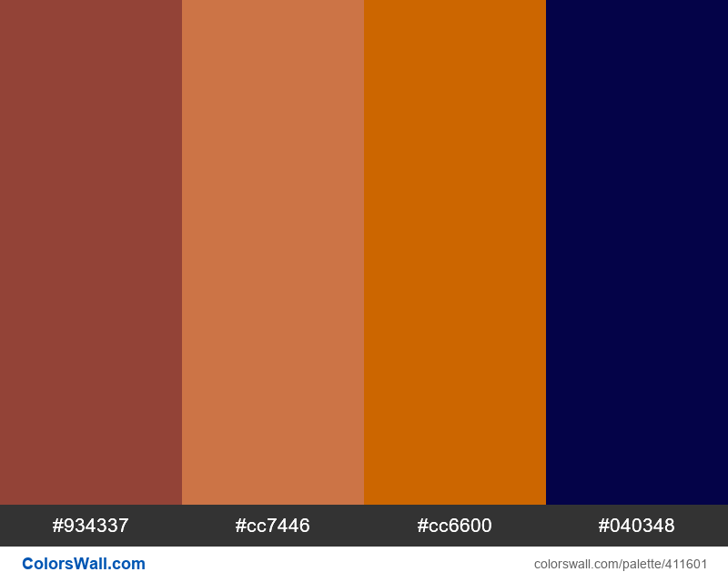 HEX: #934337, RGB: (147, 67, 55); HEX: #cc7446, RGB: (204, 116, 70); HEX: #cc6600, RGB: (204, 102, 0)