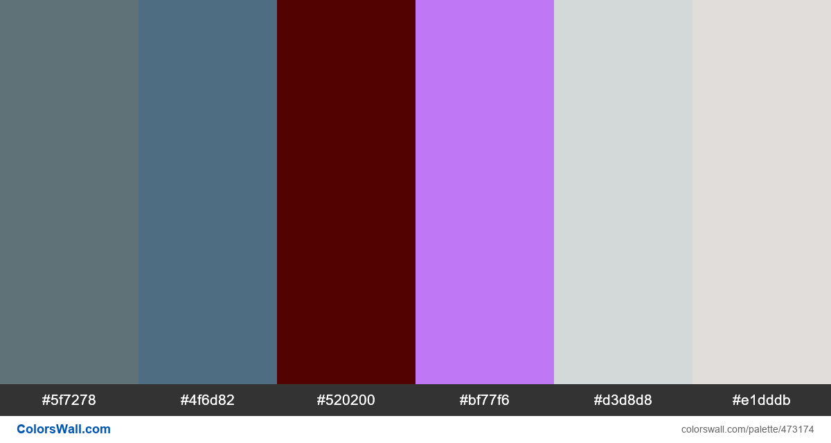 HEX: #5f7278, RGB: (95, 114, 120); HEX: #4f6d82, RGB: (79, 109, 130); HEX: #520200, RGB: (82, 2, 0)