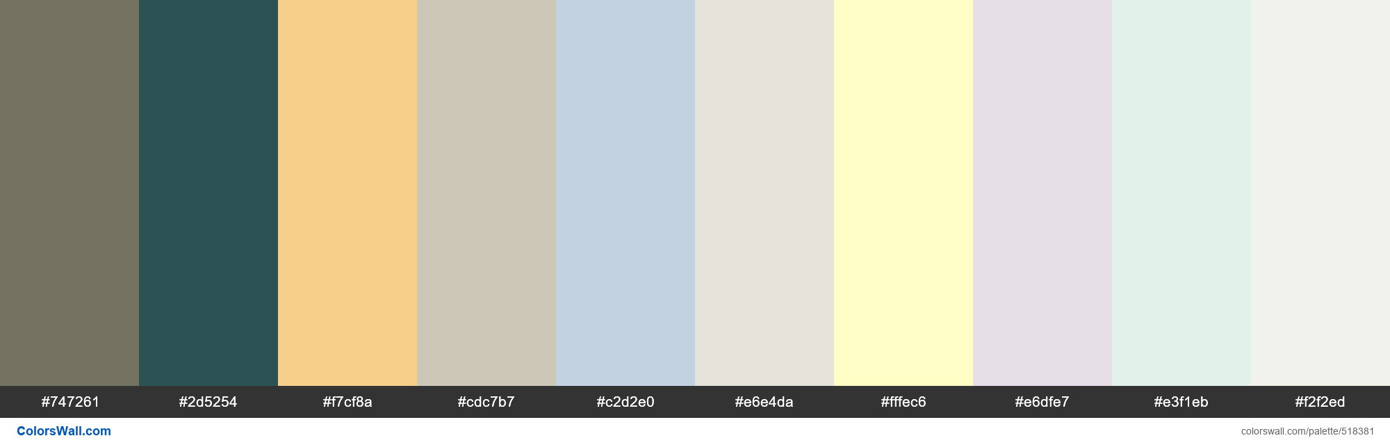 HEX: #747261, RGB: (116, 114, 97); HEX: #2d5254, RGB: (45, 82, 84); HEX: #f7cf8a, RGB: (247, 207, 138)