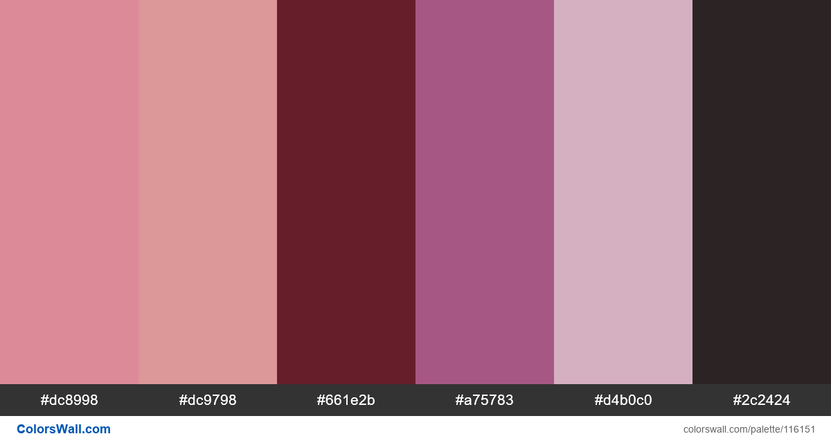 HEX: #dc8998, RGB: (220, 137, 152); HEX: #dc9798, RGB: (220, 151, 152); HEX: #661e2b, RGB: (102, 30, 43)