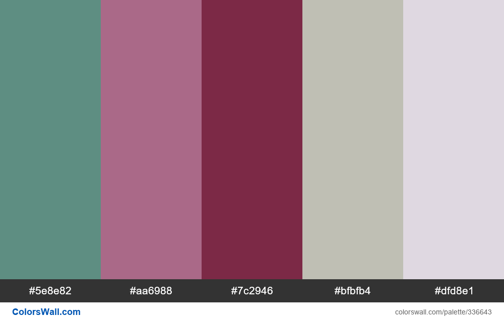 HEX: #5e8e82, RGB: (94, 142, 130); HEX: #aa6988, RGB: (170, 105, 136); HEX: #7c2946, RGB: (124, 41, 70)