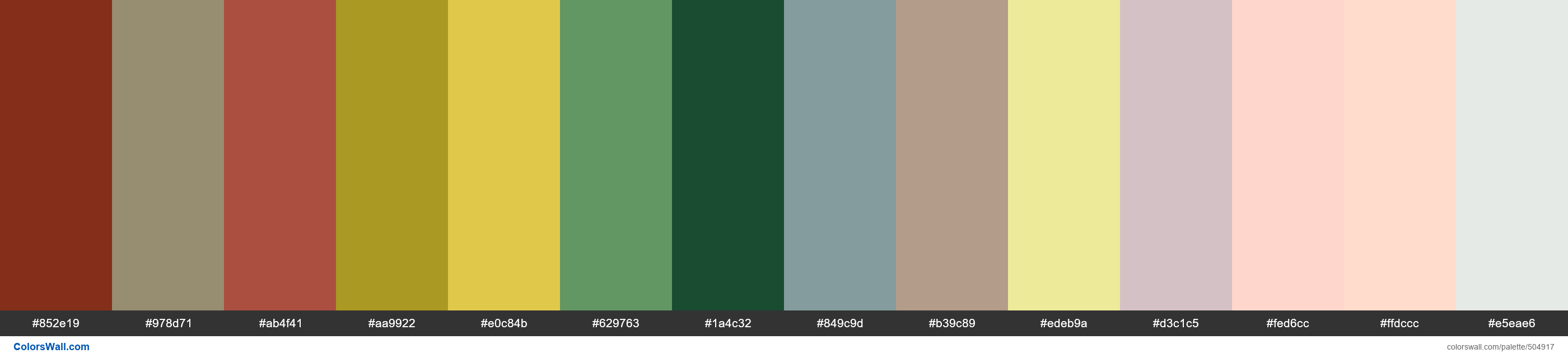 HEX: #852e19, RGB: (133, 46, 25); HEX: #978d71, RGB: (151, 141, 113); HEX: #ab4f41, RGB: (171, 79, 65)