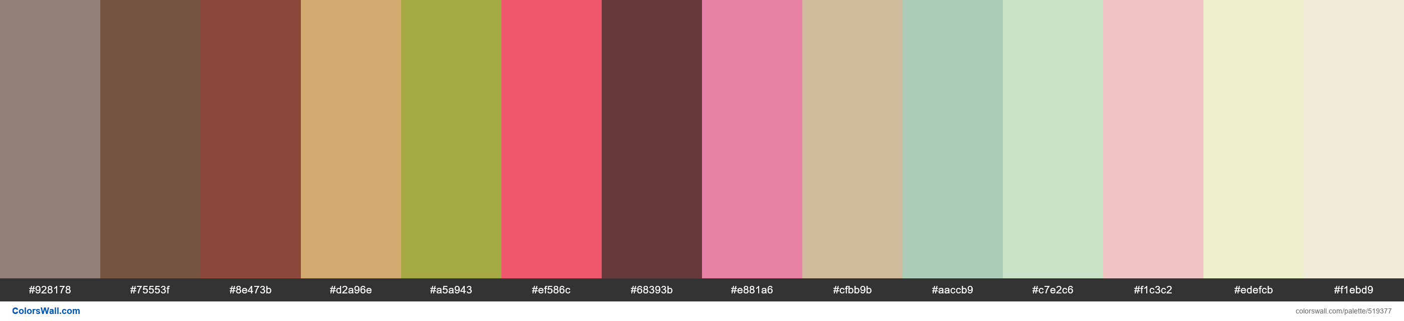 HEX: #928178, RGB: (146, 129, 120); HEX: #75553f, RGB: (117, 85, 63); HEX: #8e473b, RGB: (142, 71, 59)