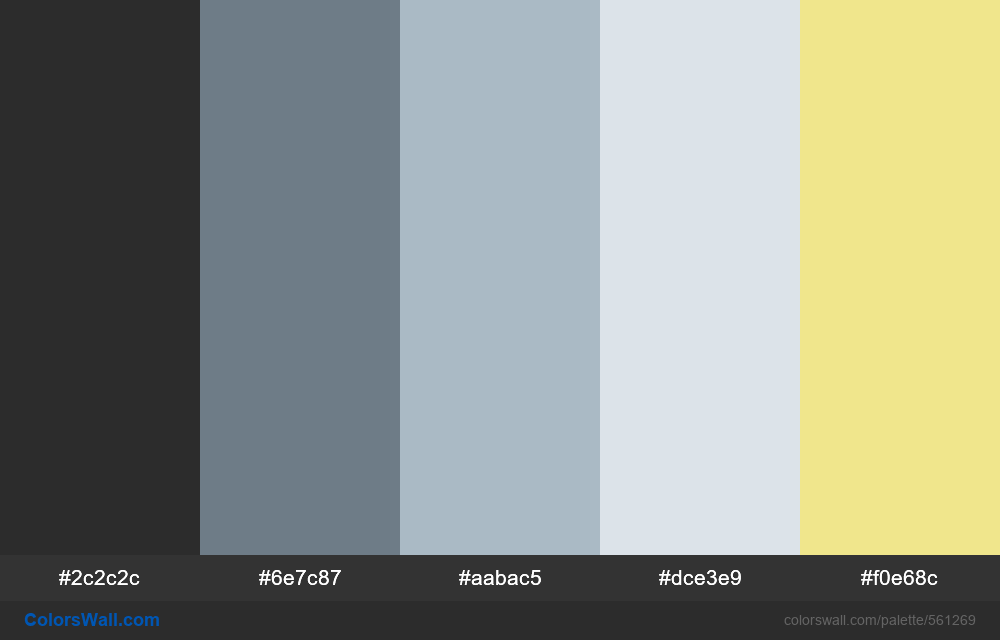 十六進位: #2c2c2c, RGB: (44, 44, 44); 十六進位: #6e7c87, RGB: (110, 124, 135); 十六進位: #aabac5, RGB: (170, 186, 197)